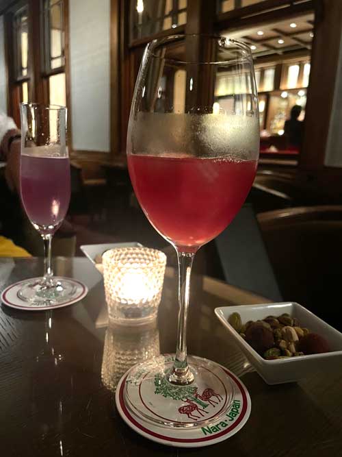 サービスのメニューは、スパークリングワインか、オリジナルカクテルもしくはモクテルから選べました。飲めない私は炎華(えんか)というモクテルにしました。クランベリージュース、オレンジジュース、桜シロップの組み合わせです。