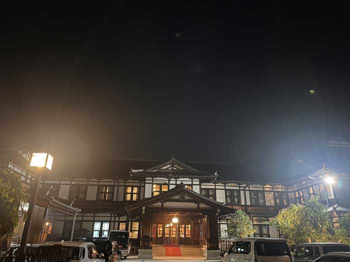 日が暮れてからの奈良ホテル正面。夜見ても美しいです。