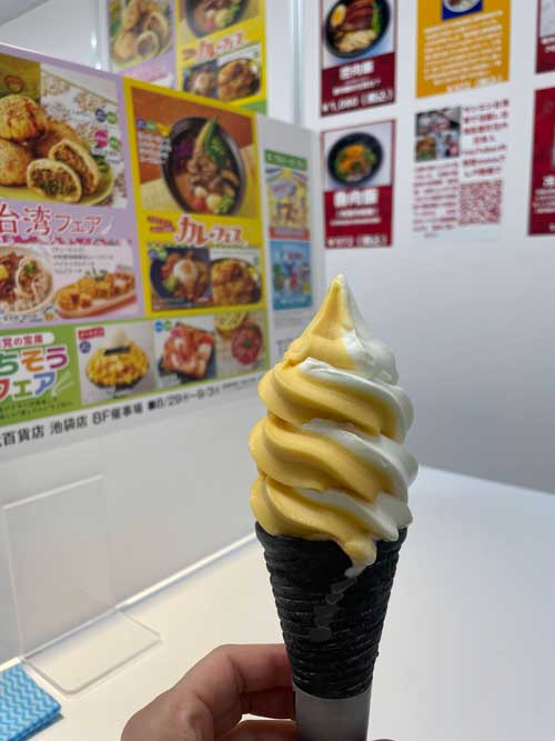 池袋の東武百貨店で開催の台湾フェアに行ってみました。杏仁ソフトとアップルマンゴーソフトのミックスのソフトクリーム550円を。サッパリとした甘さで美味しかったです。