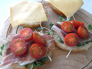 コーンパンには、カイワレ大根とサンダニエーレハムと、プチトマト、チェダーチーズのスライスを。