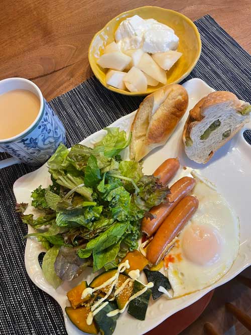京都土産のトムソーヤーのパンで朝ごはん。豆パンと塩パン。サラダももりもり。相変わらずトマトではなく、かぼちゃで赤カテゴリの野菜を摂っています。急いでいたのでマヨネーズと黒トリュフ風味の粉チーズはささっと掛けるだけ。