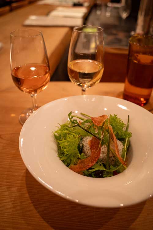 夫はハンバーグ。こちらも美味しかったです。飲み物はマダムお勧めのペアリングで、この段階では中国産のワインを進められていました。こういうのもあるのか…と面白かったです。