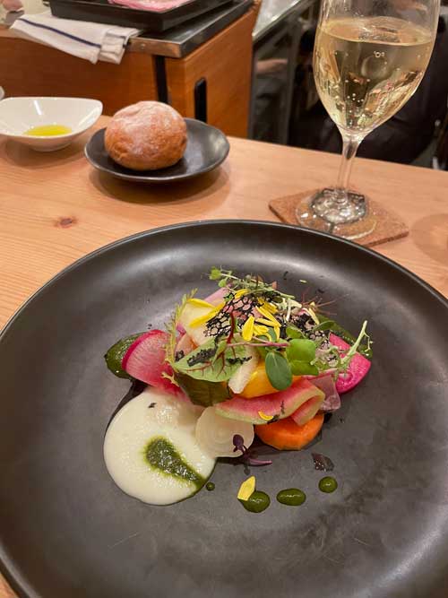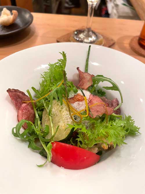 自家製のパンも運ばれ、前菜は、鹿児島カンパチスモーク お野菜とフルーツ。