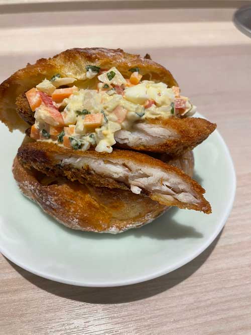 という訳で、部屋でコーヒーを淹れて朝ごはん。まずはアジフライタルタル。タルタルが具沢山で、実質サラダです。