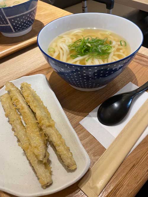 私はごぼ天うどん720円。天ぷらのさくさくごぼうが美味しいし、スープもほっとするし、うどんの麺の柔らかさも福岡に帰ってきたという気分にさせてくれます。