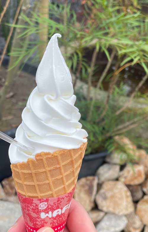 道の駅にもてくてく歩いていき、お買い物の後、こちらで極上 みるきぃソフト420円を。その名の通りミルキーで美味しかったです。いいリフレッシュでした。