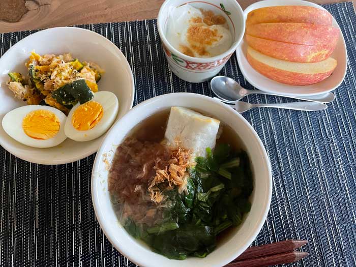 ついつい野菜を摂らねば野気持ちで、ほうれん草を入れ過ぎてしまいました。あとは、かぼちゃをそろそろ食べてしまいたい感じだったのでサラダにしてゆで卵を添え、各自好きに混ぜ合わせるスタイルです。