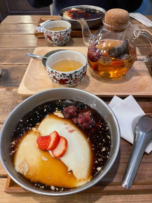 私の豆花はプレーンな台湾豆花480円。タピオカと小豆と苺のトッピング。最近豆花をずっと食べたいと思っていたので願ったり叶ったりです。