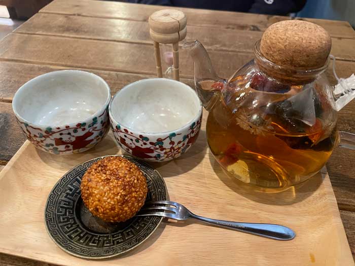 熱々のゴマ団子もついていて、思いがけず嬉しかったです。砂時計がセットされ、全部落ちたら飲み頃とのこと。後はお湯のポットも添えられていて、好きに飲めるのもめちゃくちゃ嬉しい。