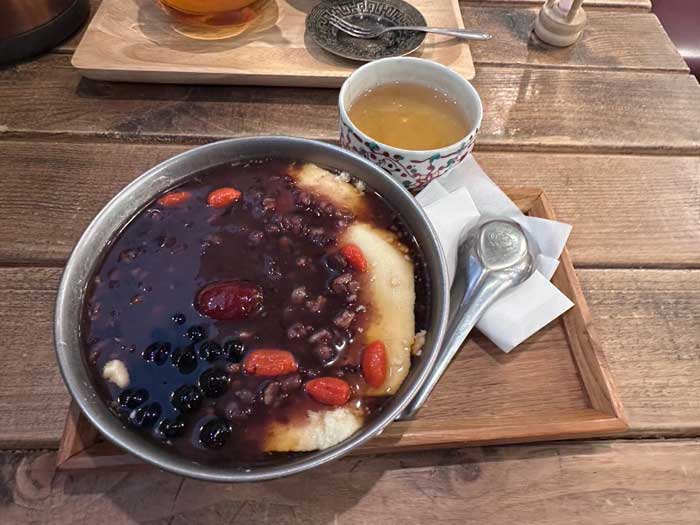 お茶は薬膳茶800円で、ナツメ、クコの実、菊の花が綺麗。味も疲れた身体に染み渡ります。