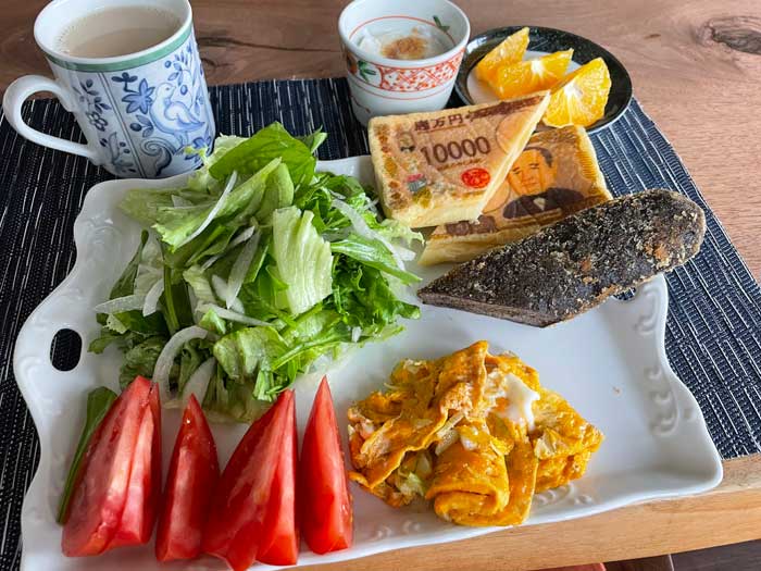 昨日渋沢逸品館 TSUNAGU marchéで買った渋沢栄一的なパンで朝ごはん。一万円的な図柄がプリントされた、おさつパンはさつまいも餡のパン。黒いのはカレーパンで、ステッキをモチーフにしています。