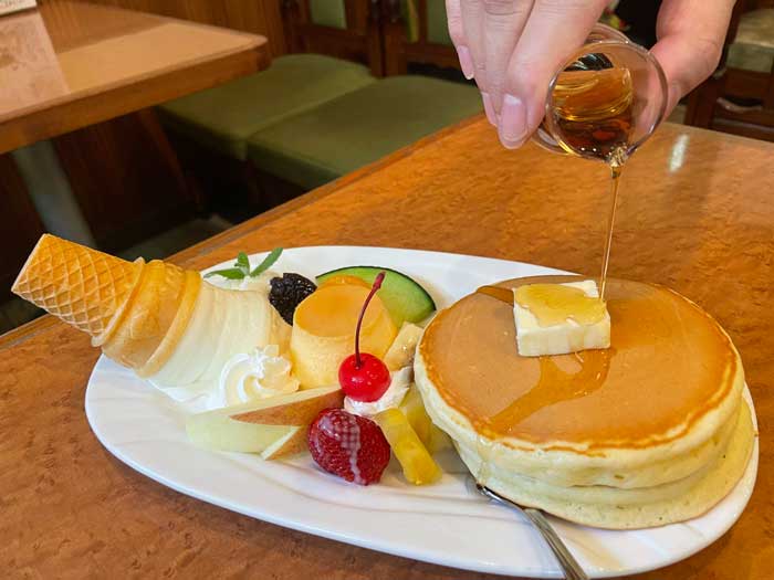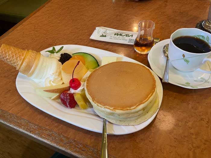 ソフトクリームも美味しかったし、その他も色々ときちんと手づくりしていて美味しそうなので、次回はクリームあんみつにしようと決めていました。しかし夫がホットケーキも食べたいというので、絶対に分担してくれることを条件にスペシャルホットケーキのセット1,200円になりました。前回と似ているので個人的にはちょっと…ですが次回こそ。飲み物はホットコーヒーですっきりと受けることにしました。セットにすると+400円。