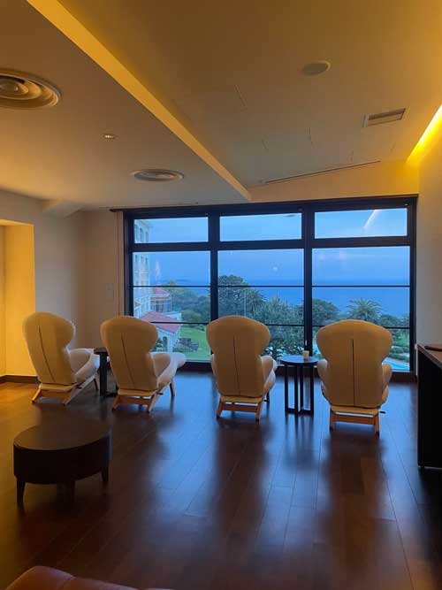 日の出とともにお風呂に行ってみましたが、曇り空とこの季節の角度で見れませんでした。見れなくとも露天風呂は本当に気持ちがよいのでゆっくり満喫し、誰もいない女性専用ラウンジで一休み。