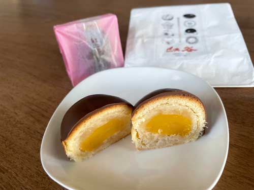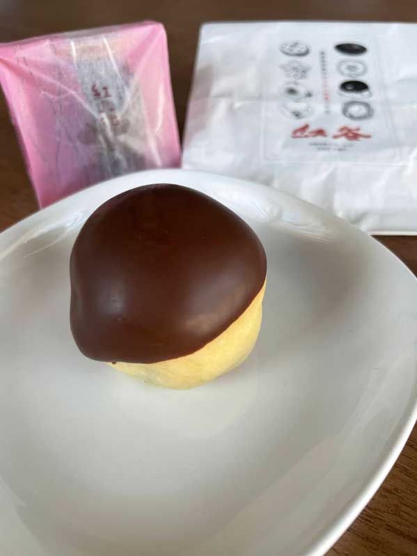紅花というお菓子、栗が白あんで包まれた焼き菓子で、チョコレートでコーティングされています。和菓子のような洋菓子のような、ハイブリッドな美味しさ。コーヒーとともに味わいました。