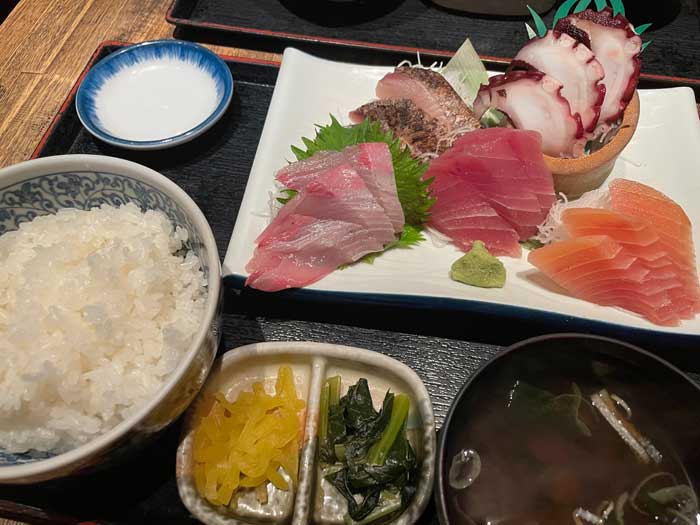 地魚刺身定食1,380円にしました。ひらまさ、まぐろ、たこ、赤マンボウと後なんでしたっけ。