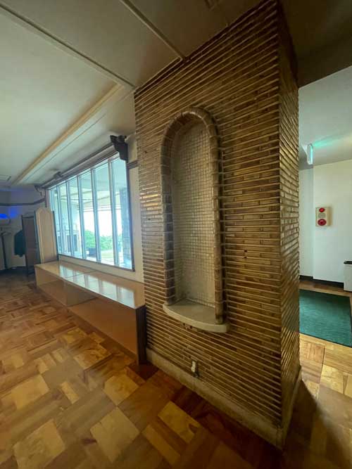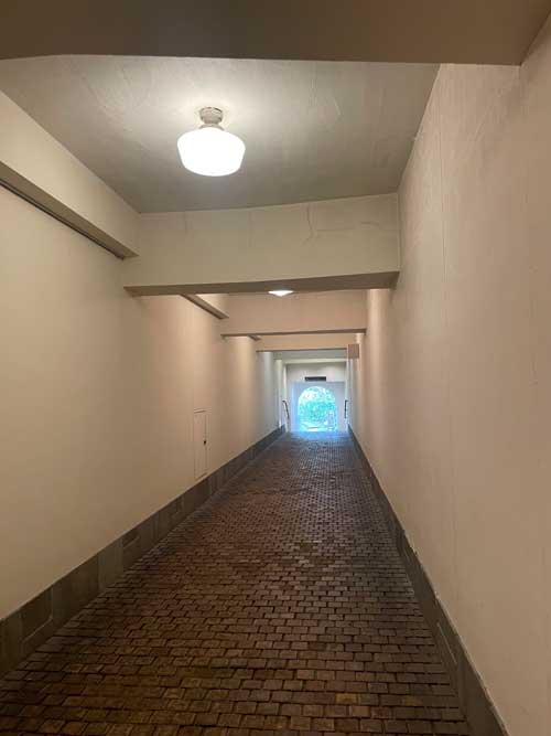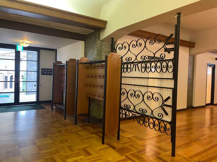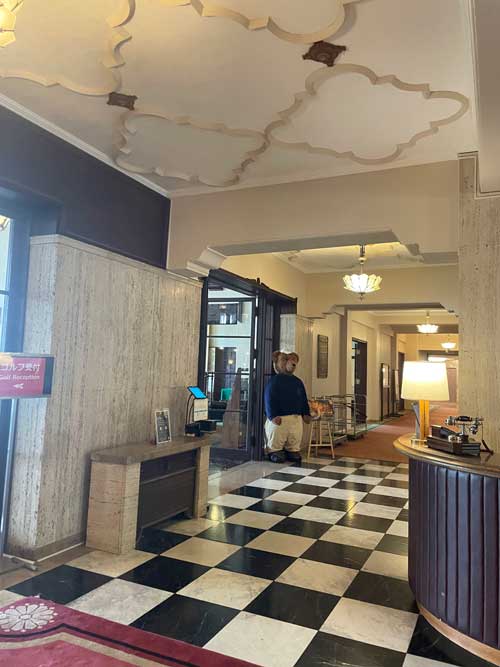 ホテル棟に入り、タイルのような茶色の床の通路や階段を歩いた時に、独特に香るものがありました。古いホテルの匂い?なんて話しながら歩いていたのですが、後で散策MAPをみてみたら「昔の鉄のスパイクの名残で、桜の木にコールタールを染みこませてい」たという記述がありました。今もその香りは残っているというのでそれでした。ちゃんとこういうものは読んでおくべきだなあと思いました。
