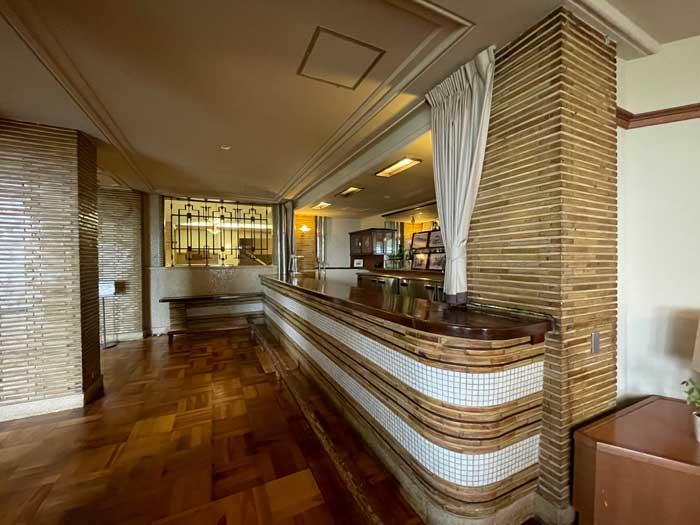 右手前のクラシカルな電話があるカウンターは、かつてのフロントだとか。
