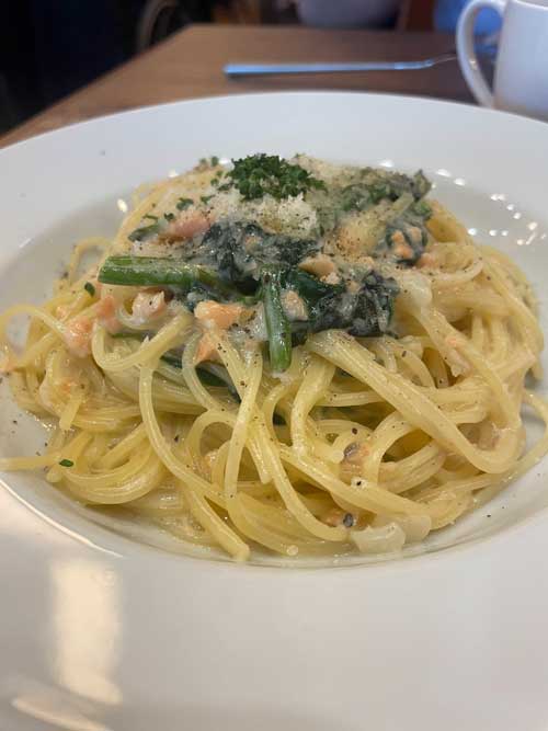 パスタはサーモンとほうれん草のクリームパスタ、サラダバーセットで2,150円。