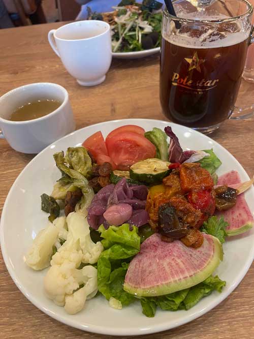 ソフトドリンクでアイスコーヒーにしたかな。夫は他にアルコールもオーダー。サラダバーは種類が多くて楽しい。お惣菜も色々。さつまいものレモン煮はほぼデザートでした。