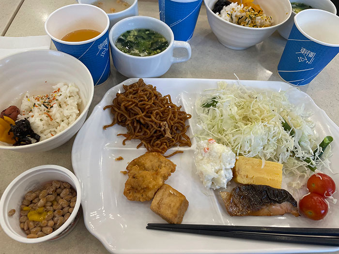 東横インは朝食付き。大阪っぽく焼きそばなんかもあったりします。品数も頑張りすぎなくてちょうどいい感じ。