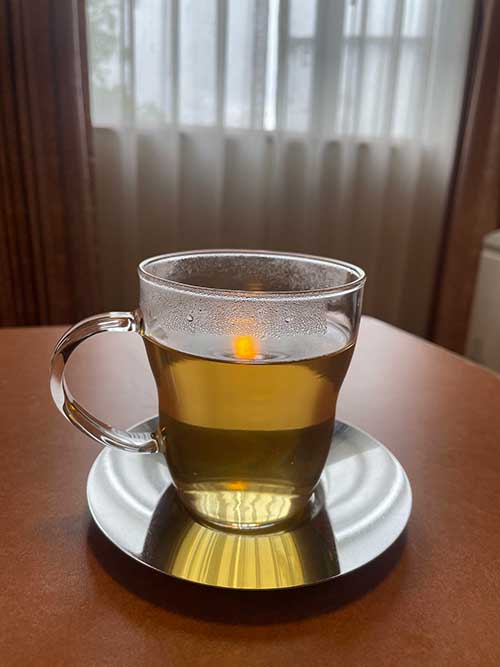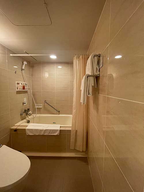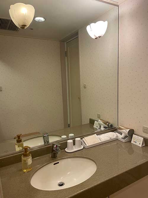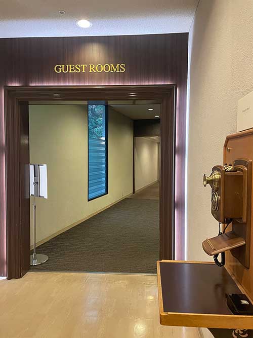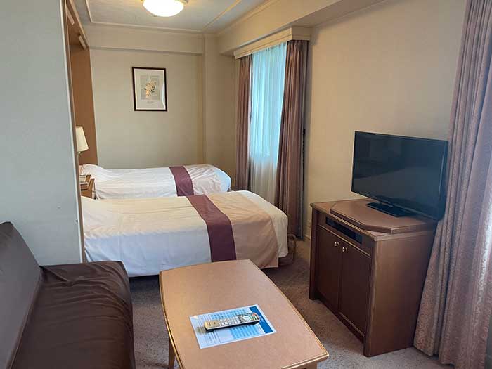 チェックイン後、アメニティはフロント前で必要なものをいただきます。紅茶類もドリップコーヒーも大変ありがたかったです。部屋は東館を予約しました。間取りがちょっと面白くて、細長い部屋の奥にベッドが並んでいます。