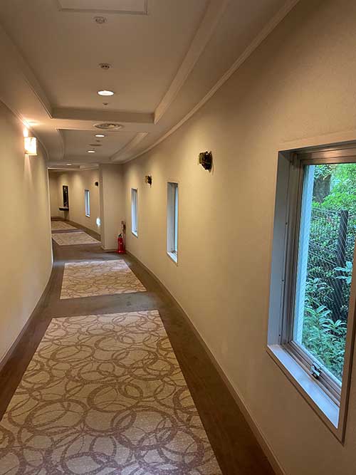 ちょっとカーブした廊下がなんとも良いです。右側の緑のあたりは翌日散策しました。