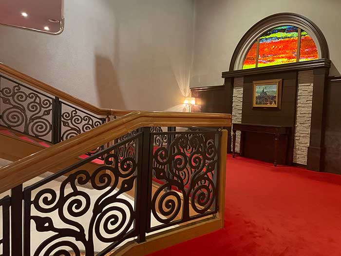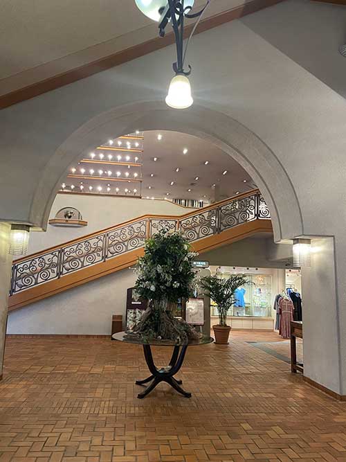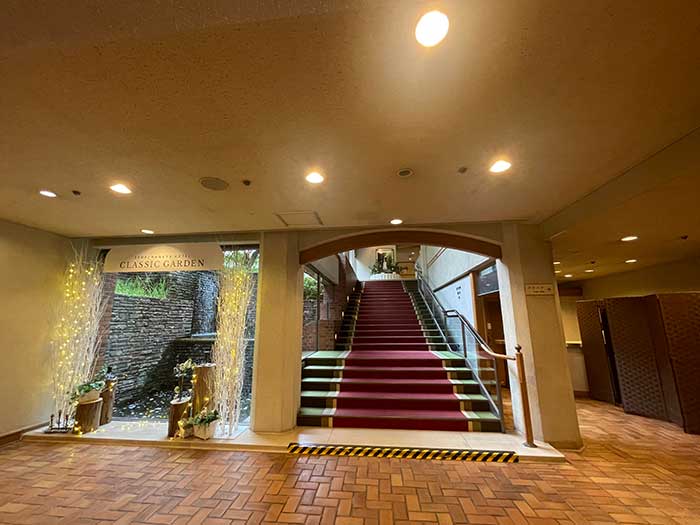 階段をおりきって振り返ったところ。フロントやエントランスに辿り着きます。