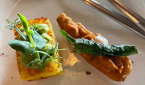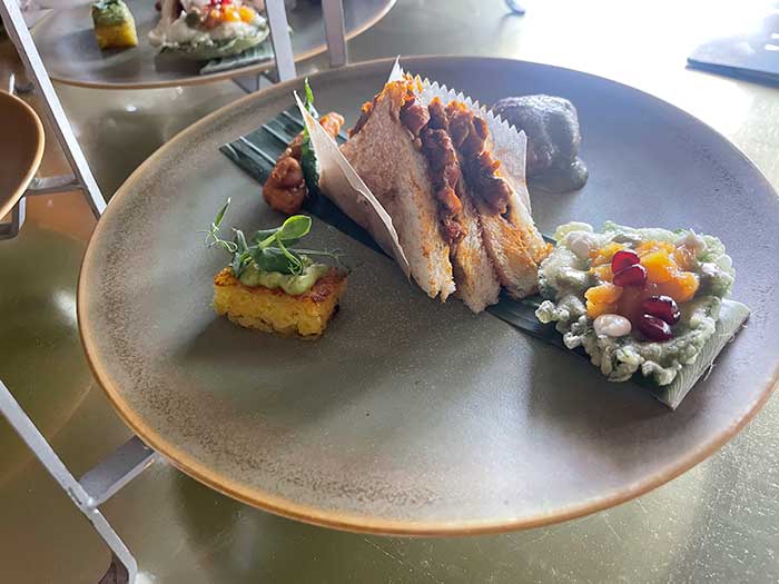 グリーンピースドクラ、ベビーコーン65、大葉チャート スパイスフルーツ、ラムケバブ、チキンティッカサンド。
