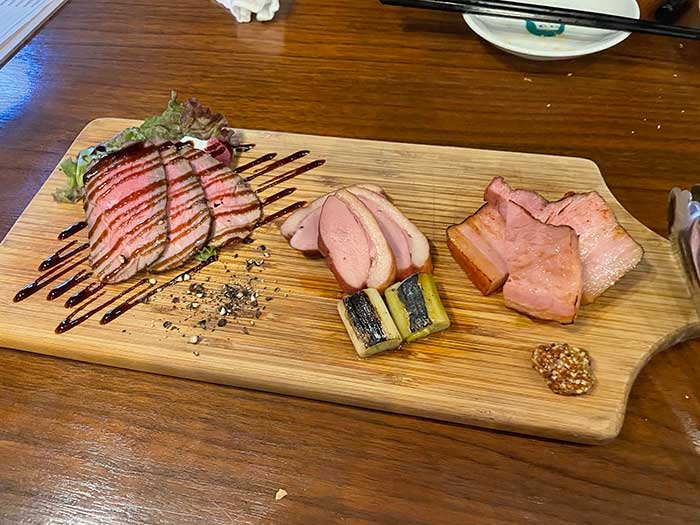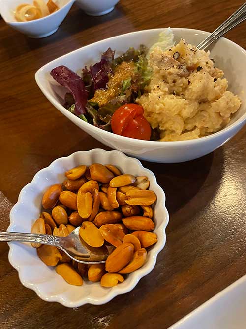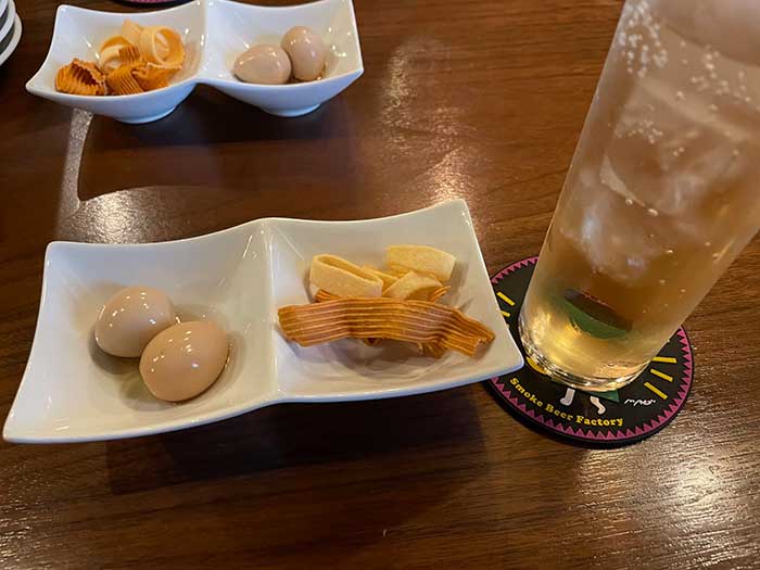私はジンジャーエールで。そしてお通しで出てくるウズラの卵の燻製など、すでに美味しいです。