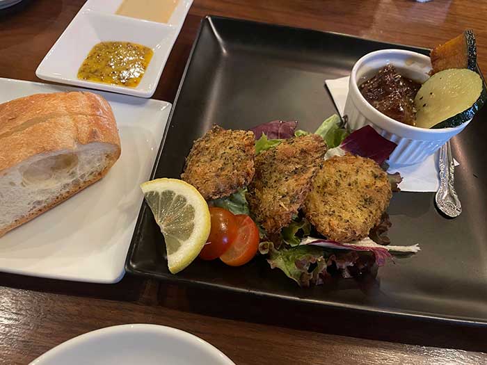 周年企画で大塚店のペアリングフードが鱈のハーブフライと牛ホホ肉煮込みにバゲットを追加したもの。