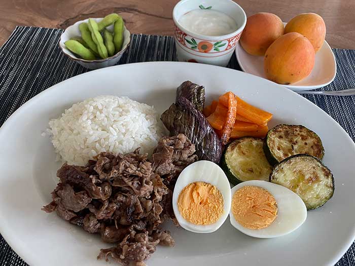 いい感じの和牛の薄切り肉を昨夜全て食べきれず、今日の晩御飯の見通しがよくわからなかったので、朝に食べてしまおうということになりました。塩胡椒ベースでちゃちゃっとソテー、野菜はオリーブオイルで焼き付けてといったかんじです。