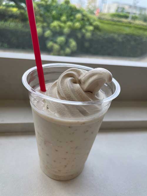 お買い物などもしつつ、次の休憩は残念ながらこの日で閉店してしまう千葉のアンテナショップ「房の駅」のピーナッツスムージーにマックスコーヒーソフトをトッピングで。