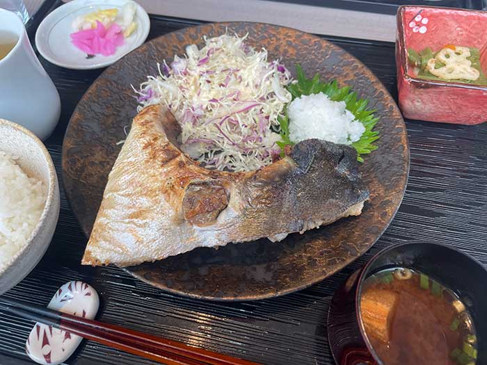 今日の焼き魚御膳はブリカマの塩焼きと聞き、カマ好きの私は即決でした。じっくり焼かれて脂乗りの良い美味しいカマで、身がどんどん発掘されていくのも楽しいです。甲殻類と貝類を避けているので、お味噌汁は配慮いただきました。