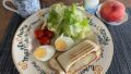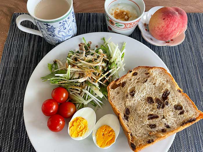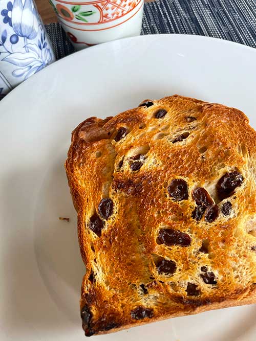ブレッドワークスのラムレーズンブレッドで 2025.07.08 みずみずしいラムレーズンのパン。トーストした方がより際立って感じられます。 果物は、私は桃など色々、夫はメロンやスイカなどでそれぞれ旬を楽しんでいます。