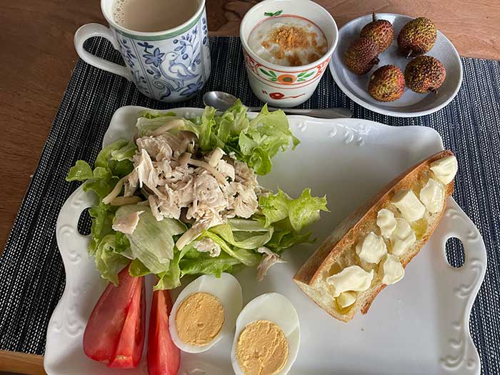 一応卵は基本的にゆで卵を続けているし、サラダのドレッシングはノンオイルか、エキストラバージンオリーブオイルを使った自家製か、ツナの場合はそのオイルを使うという3パターンにしております。今朝はノンオイル、つまりキャベツのうまだれを蒸し鶏やしめじをチンしたものに和えて、レタスに掛けるといった具合です。