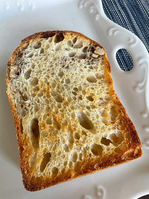自家製のくるみブレッドのトーストで朝ごはん。ソーセージは昨日の夜の残りの食べ応えのある大きなものをシェアで。