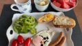 果物は桃なのですが、ヨーグルトには珍しくバナナのトッピングがあります。何やら夫が先日大きなスイカを1玉購入したところ、バナナも1房持っていって、ということでいただいたのだそう。このバナナがさっぱりして苦手な私もおいしく食べられたので、しばらくこのトッピングが続きます。