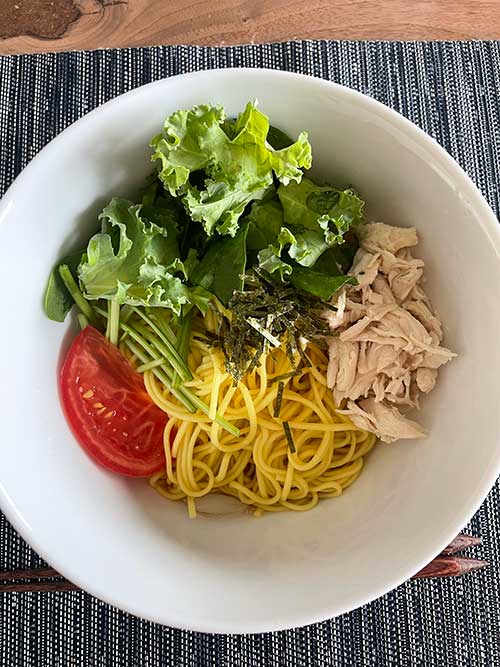 刻み海苔は付属のトッピングで、鶏ささみの酒蒸し、トマト、青菜類は用意したトッピング。