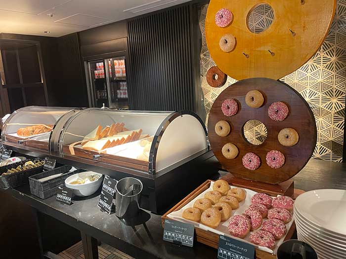 朝一番で朝食ではなくさくらタワーのお風呂へ行ってきました。すっきりと目覚めてクラブラウンジへ朝食へ。このドーナツのボードを見るとテンションが上がりますが、ここまで辿り着かないだろうなあ。