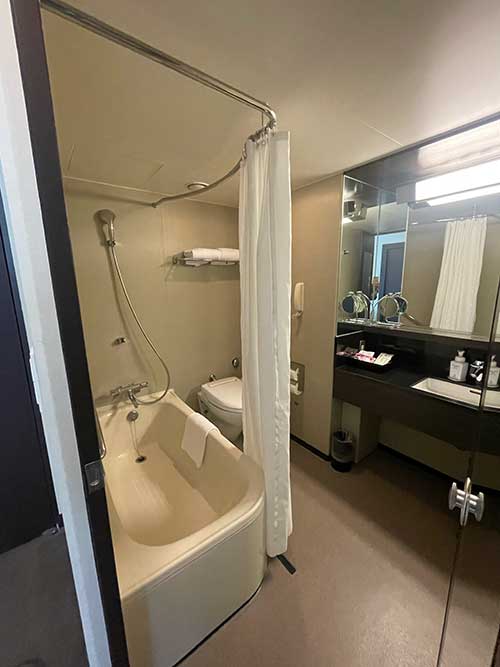バスタブの配置がこんな風になっているのは初めて見ました。シャワーカーテンでぐるりと囲まれます。