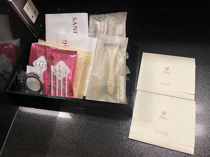 バスルームとアメニティ類。基礎化粧品はリクエストベースでとのことで、チェックイン時にいただきました。