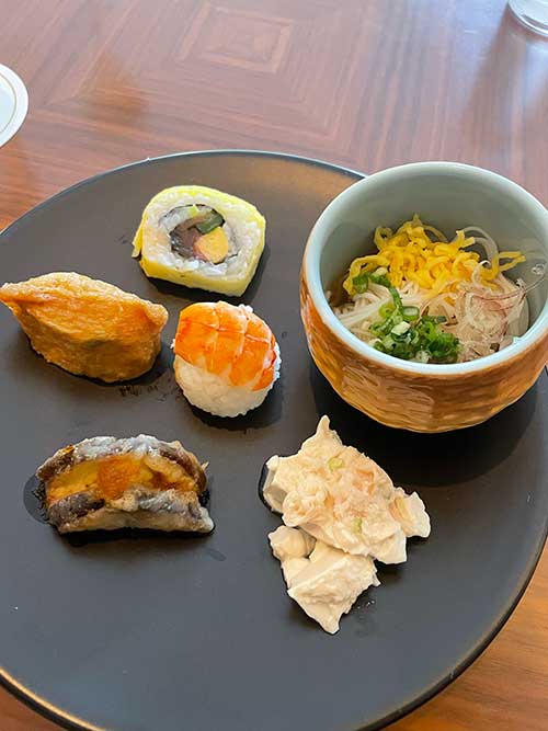 まずは高輪の「花雅」の方から。和のメニューが並びます。品数はそんなに多くないし、アレルギーで食べられないものもあるし、そんなにお腹は空いていないしということでこんな感じ。海老の手毬ずしは赤い色が欲しかったので、夫へ。