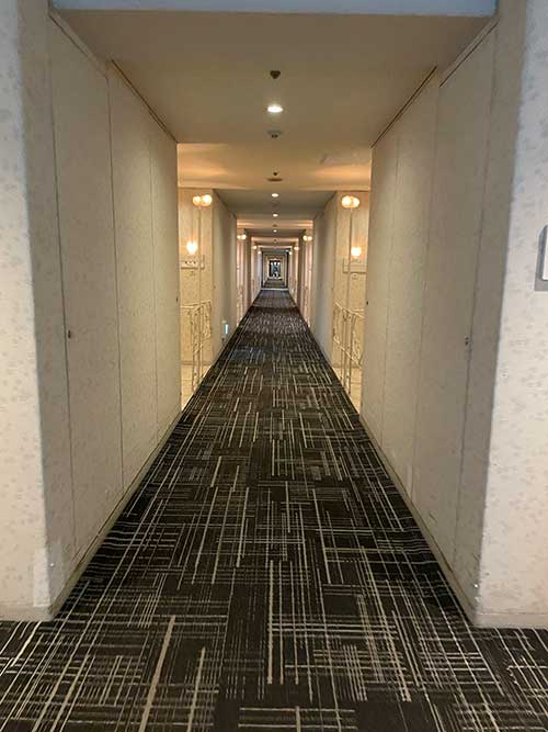 ラウンジの入り口のドアを見過ごして、この廊下のある程度まで歩いてしまいました。細長い建物だなあと実感しました。あとでこの反対側も歩いております。