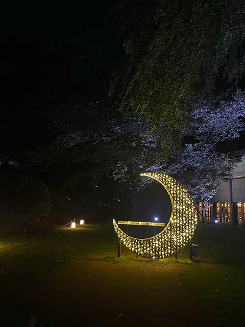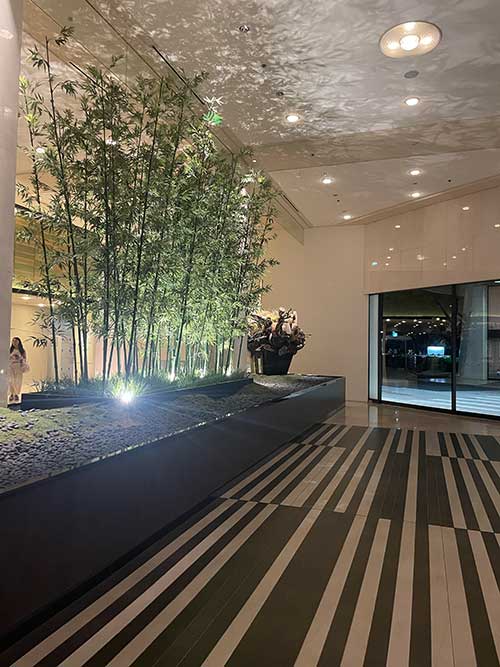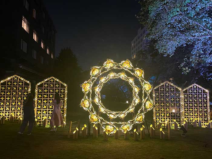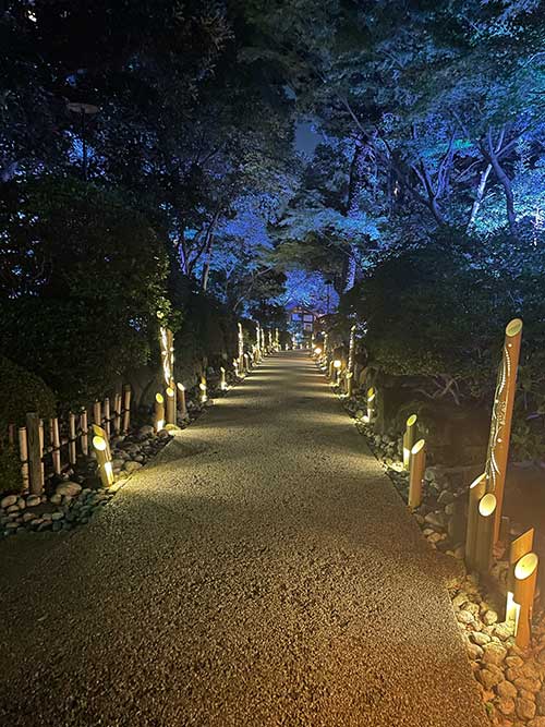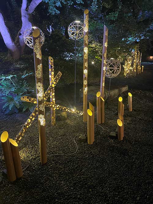 3つのホテルの間にある日本庭園は、竹あかりと題してこのような竹細工の灯りの演出がそこかしこにあり、とても幻想的でした。
