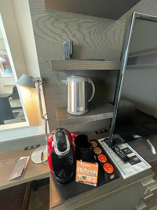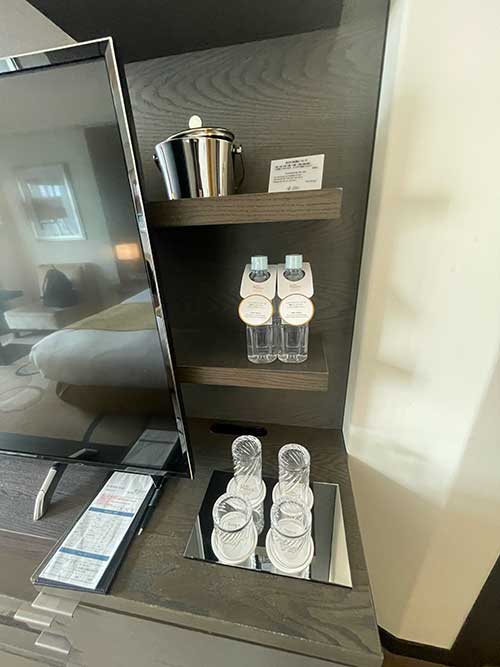 テレビの左右にミニバー的な一式が備えられています。引き出しに、カップ&ソーサー類が入っていました。