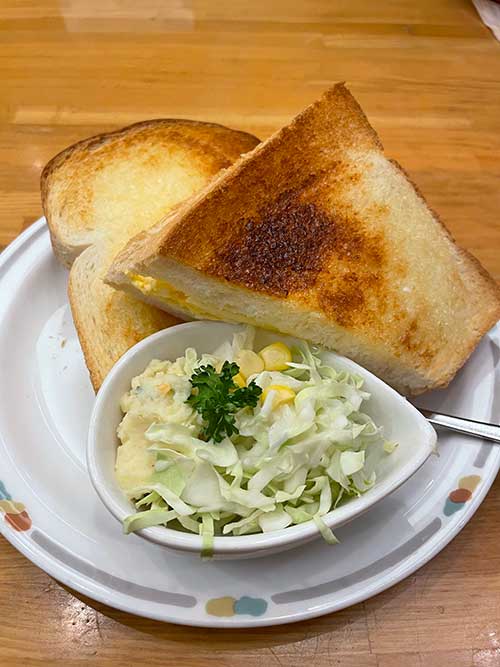 コールスローとポテトの組み合わせのサラダを食べてから、表面がカリッとトーストされたサンドウィッチに。たまごとチーズ、きゅうりがサンドされています。変わらぬおいしさにホッとします。