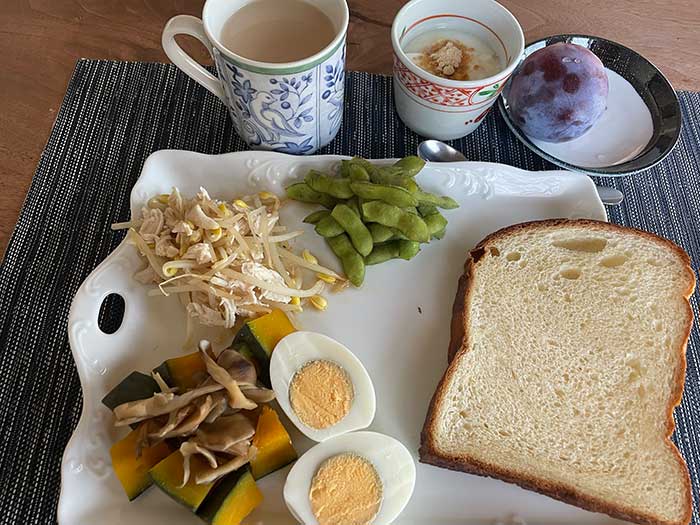 トマトの在庫がなくなり、というかかぼちゃを1玉買っていたのでそろそろそれを地道に食べていく期間としました。朝の赤い野菜をかぼちゃにすると、色がくすみがちになってしまうのは残念。でもカボチャはホクホクして美味しいのでそれでよし。今朝はしめじと一緒に出汁醤油系の味付けにしています。