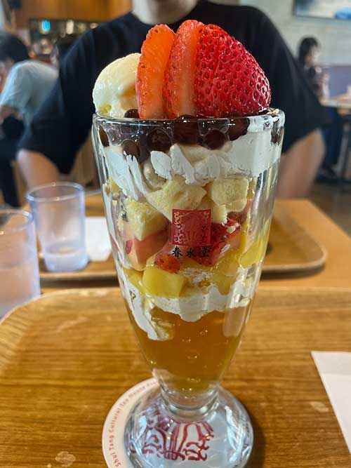 いちご、バニラアイス、愛玉ゼリー、マンゴー、台湾カステラ、紅茶生クリーム、タピオカの構成で大満足でした。