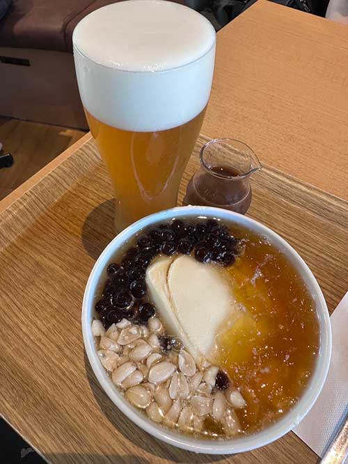 スマホのオーダーだったので運ばれてくるまで気が付かなかったのですが、春水堂ってビールもあるのか。台湾豆花はピーナッツとタピオカと愛玉ゼリーのトッピングのようです。