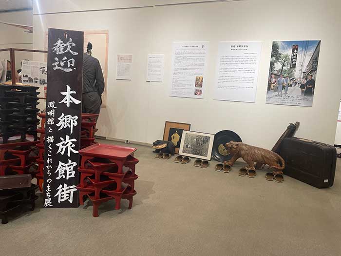 本郷は下宿屋さんがたくさんありましたが、とある時期から修学旅行生を受け入れる旅館に転換、そしてその旅館も数少なくなりました。今ではその代表格と言って良い鳳明館を中心とした展示を見学しました。